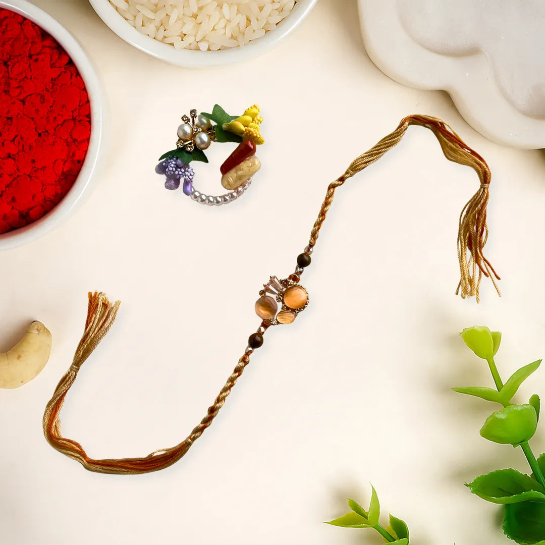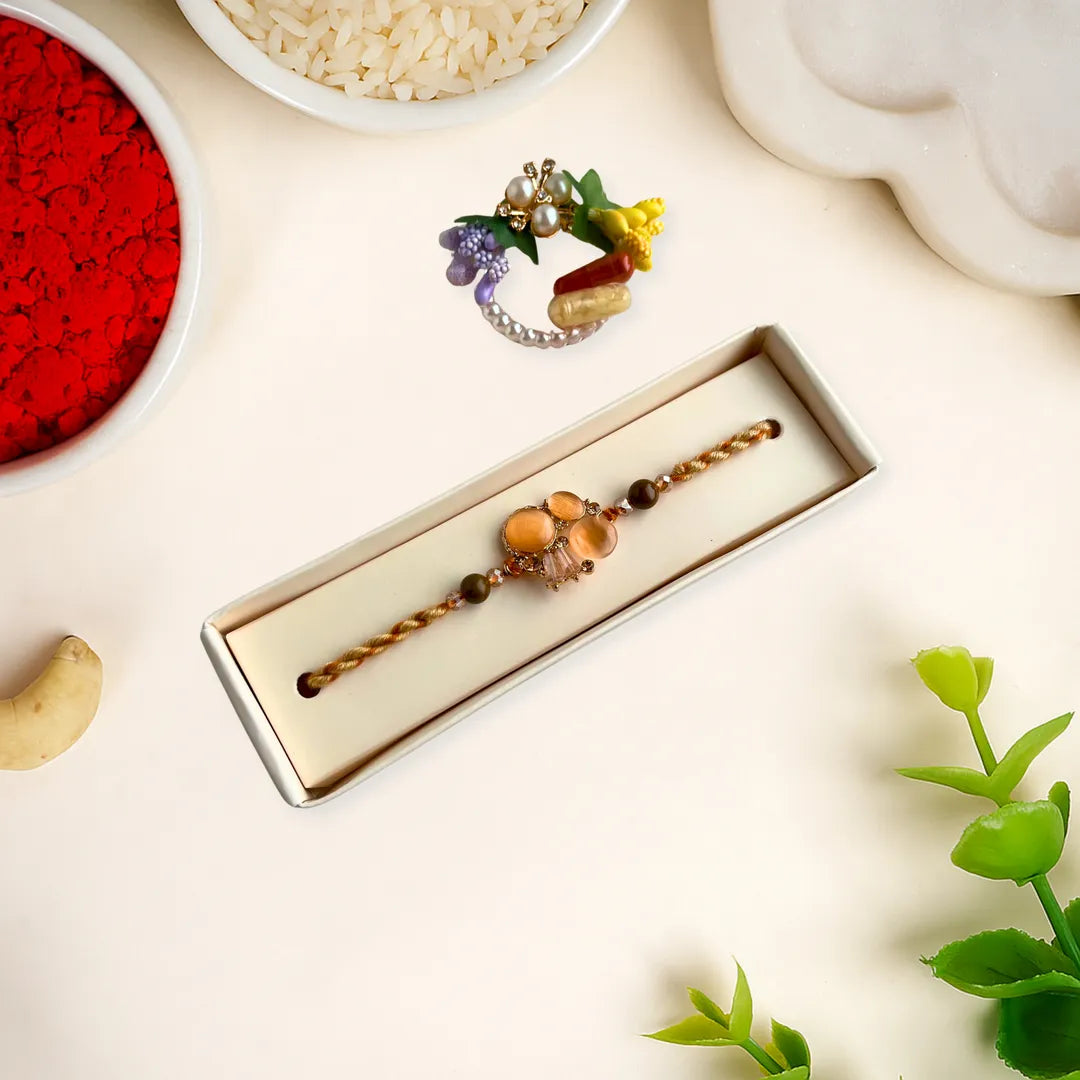 A Sacred Thread of Love. Celebrate the bond of siblings with this exquisite rakhi. Handcrafted with care, it symbolizes protection and affection. Made with vibrant threads, beads, and embellishments, it radiates beauty. Tie this auspicious thread on your brother's wrist and express your love. Strengthen the bond and create cherished memories