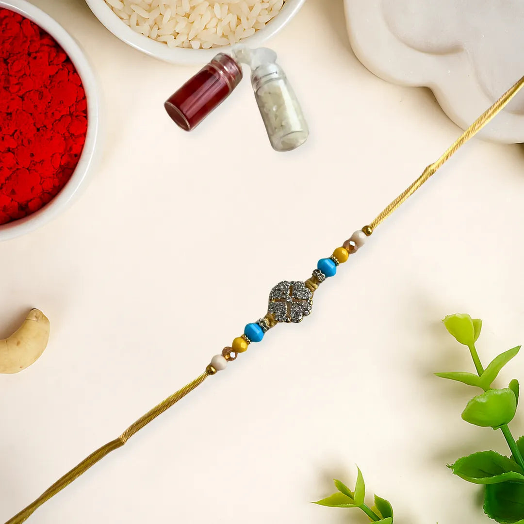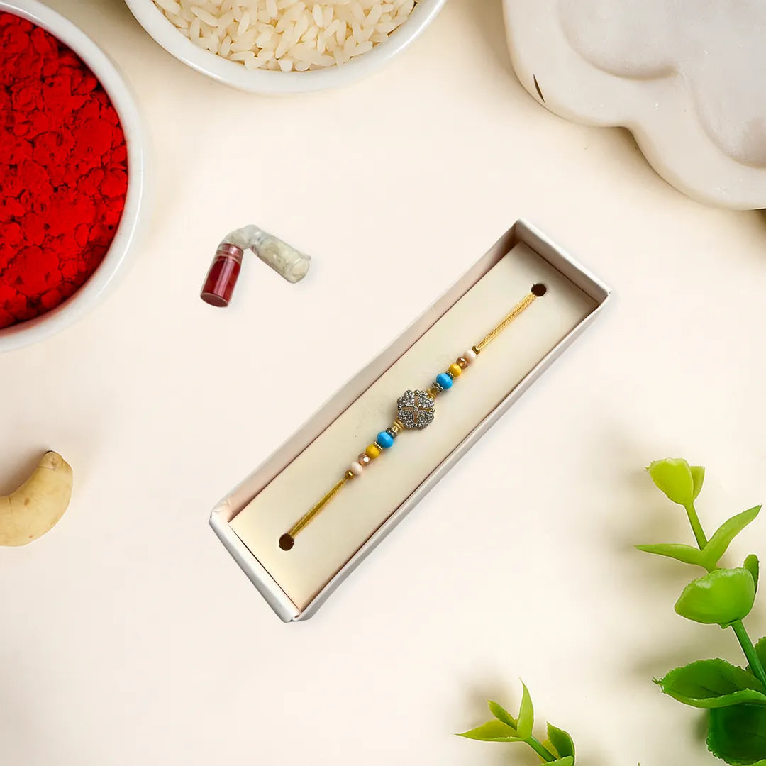 A Sacred Thread of Love. Celebrate the bond of siblings with this exquisite rakhi. Handcrafted with care, it symbolizes protection and affection. Made with vibrant threads, beads, and embellishments, it radiates beauty. Tie this auspicious thread on your brother's wrist and express your love. Strengthen the bond and create cherished memories