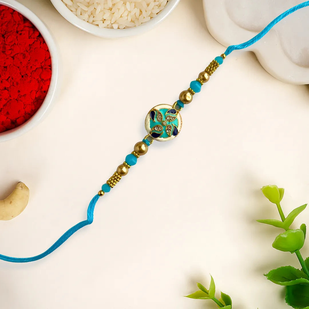 A Sacred Thread of Love. Celebrate the bond of siblings with this exquisite rakhi. Handcrafted with care, it symbolizes protection and affection. Made with vibrant threads, beads, and embellishments, it radiates beauty. Tie this auspicious thread on your brother's wrist and express your love. Strengthen the bond and create cherished memories