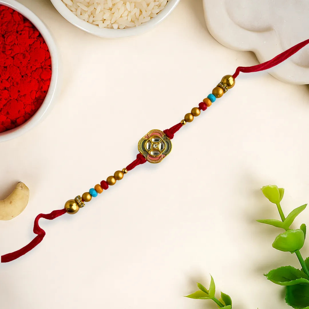 A Sacred Thread of Love. Celebrate the bond of siblings with this exquisite rakhi. Handcrafted with care, it symbolizes protection and affection. Made with vibrant threads, beads, and embellishments, it radiates beauty. Tie this auspicious thread on your brother's wrist and express your love. Strengthen the bond and create cherished memories