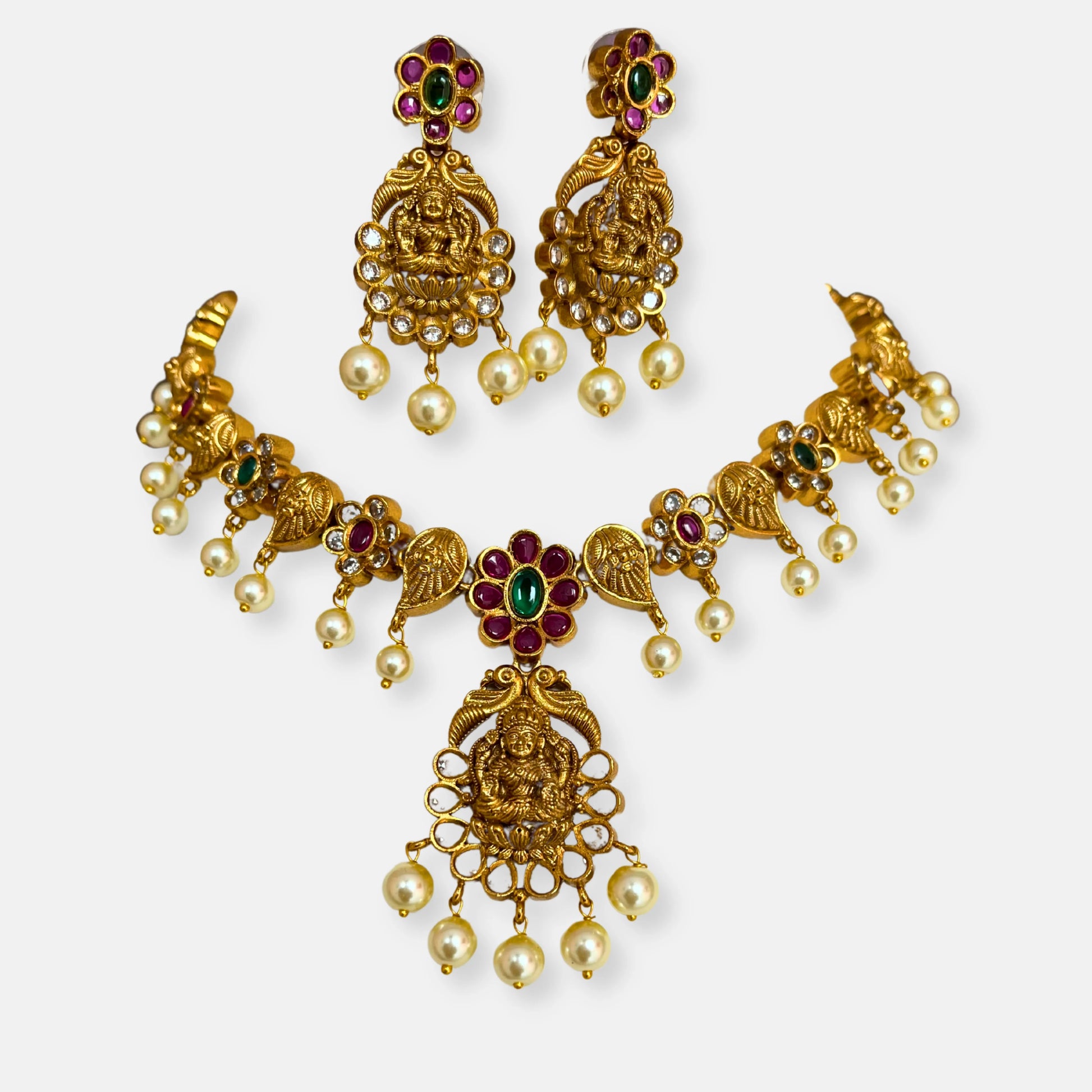 Temple jewellery originates in the royal courts and temples of ancient India. Over time, Temple jewelry evolved to become an integral part of our culture & our temple jewels will always be a remembrance of the celebration of Kemp stones and colorful gems.