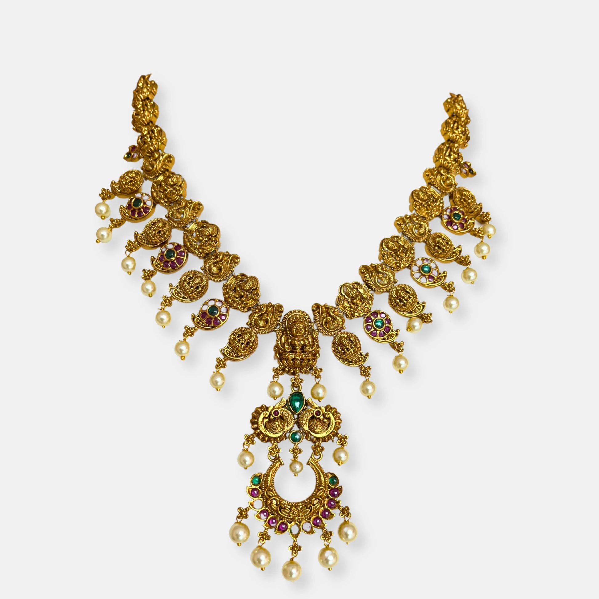 Temple jewellery originates in the royal courts and temples of ancient India. Over time, Temple jewelry evolved to become an integral part of our culture & our temple jewels will always be a remembrance of the celebration of Kemp stones and colorful gems.