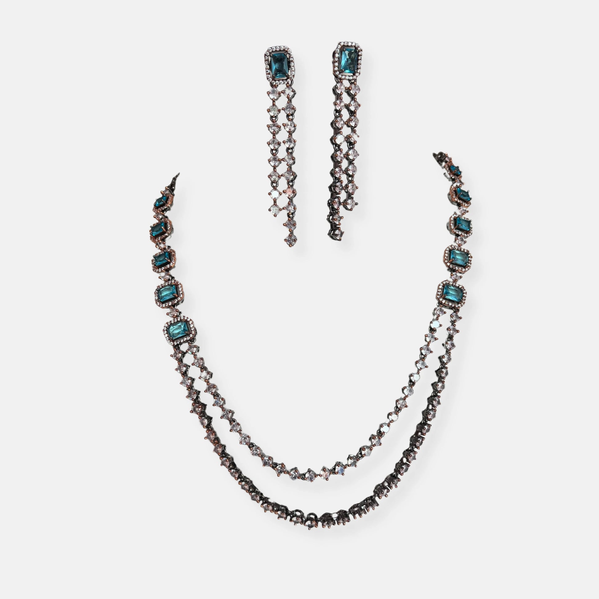 Jewelit Double Layered Aqua Necklace Set in Black Polish And Rose Gold