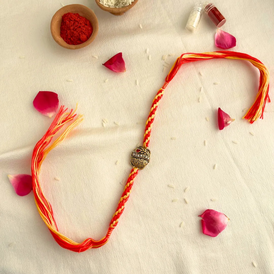 A Sacred Thread of Love. Celebrate the bond of siblings with this exquisite rakhi. Handcrafted with care, it symbolizes protection and affection. Made with vibrant threads, beads, and embellishments, it radiates beauty. Tie this auspicious thread on your brother's wrist and express your love. Strengthen the bond and create cherished memories