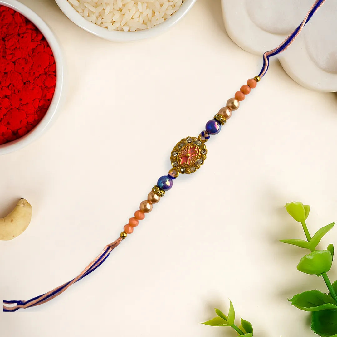 A Sacred Thread of Love. Celebrate the bond of siblings with this exquisite rakhi. Handcrafted with care, it symbolizes protection and affection. Made with vibrant threads, beads, and embellishments, it radiates beauty. Tie this auspicious thread on your brother's wrist and express your love. Strengthen the bond and create cherished memories