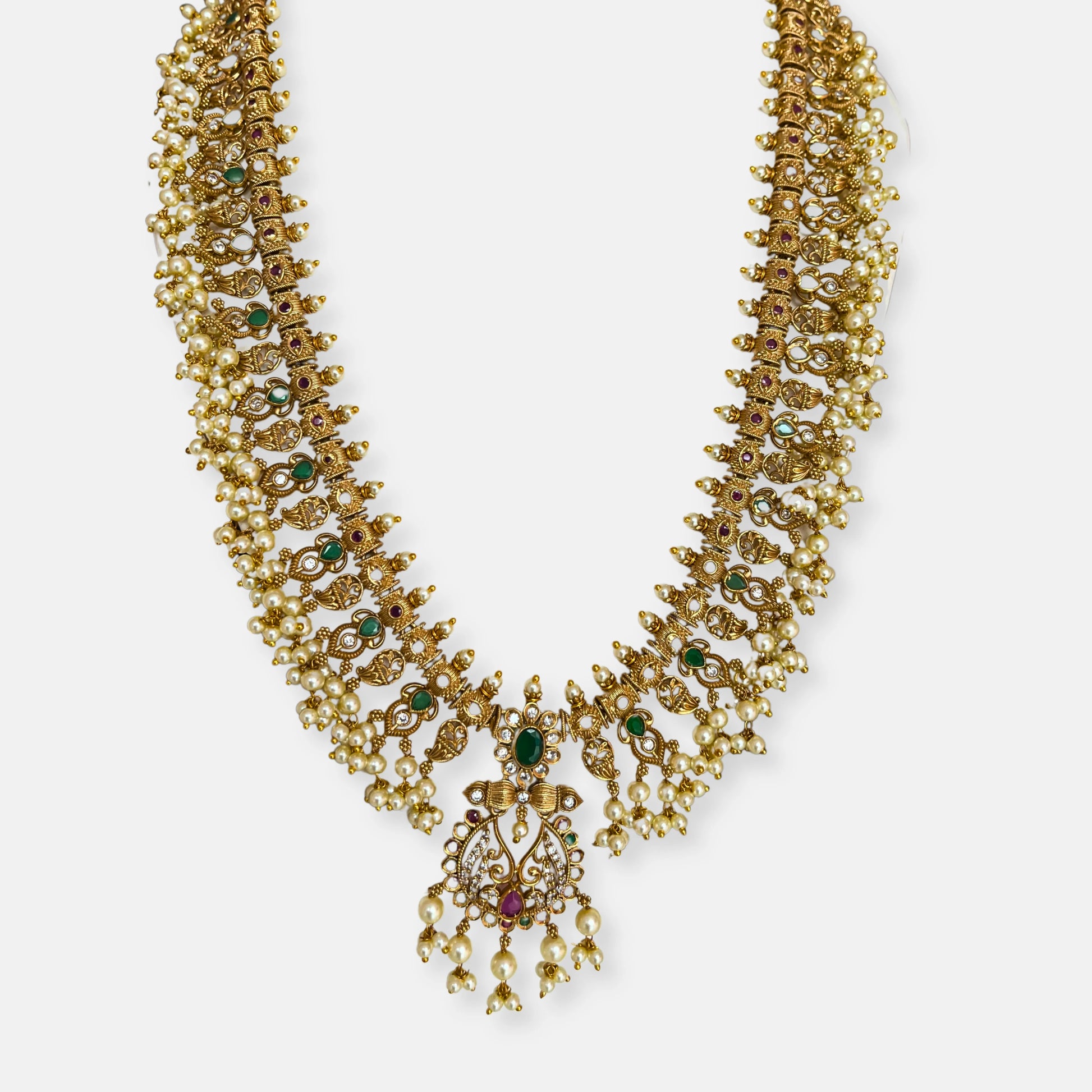 Temple jewellery originates in the royal courts and temples of ancient India. Over time, Temple jewelry evolved to become an integral part of our culture and our temple jewels will always be a remembrance of the celebration of Kemp stones, colorful gems and moti detailing to give it next to real jewellery.